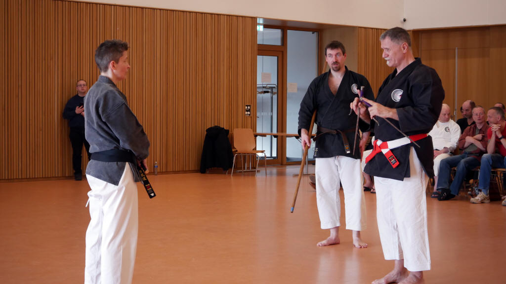 Tashi (6ème Dan Tengu-ryu Karatedo) : Bravo et félicitations à tous, sans oublier leurs Sensei respectifs, qui n'ont pas ménagé leur peine pour les amener à des niveaux qui font honneur à l’ensemble du Ryu. Les résultats ont été proclamés sous un tonnerre ! Soke Habersetzer s'était entouré pour constituer le jury de ses Experts Jacques Faieff, Président du CRB-IT, et Alex Hauwaert, tous deux 8ème Dan, ainsi que de Siegfried Hübner et Franz Scheiner, tous deux 7ème Dan, François Bellido et Roland Paulus, 5ème Dan. Il avait confié comme à l’habitude l’organisation administrative de cette rencontre à Alex Hauwaert, qui a une fois de plus assumé cette charge avec une compétence et une efficacité qu'il n'a plus à prouver à personne ! Ce fut une belle journée pour toute la « famille